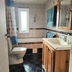 Et badeværelse med et badekar og en bruser er også til rådighed.